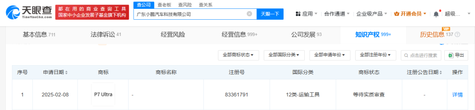 天眼查知识产权信息显示,近日,广东科技有限公司申请注册1枚“P7 Ultra”,国际分类为运输工具,当前商标状态为等待实质审查。