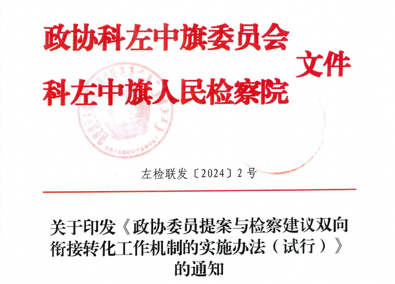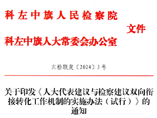 建立检政对接平台。主动构建人大代表建议、政协委员提案与检察建议双向衔接转化机制,聘任人大代表、政协委员为“益心为公”志愿者8人,为检察机关高质效办理公益诉讼案件提供“外脑”作用。转化人大代表建议、政协委员提案为案件办理34件。此项工作得到旗人大领导批示肯定。主动与妇联沟通协调,签署《关于建立共同推动保护妇女权益工作协作机制的意见》,聘请妇联主席为“益心为公”志愿者4人,推动构建妇女权益保障法律监督与社会化保护相衔接工作格局。