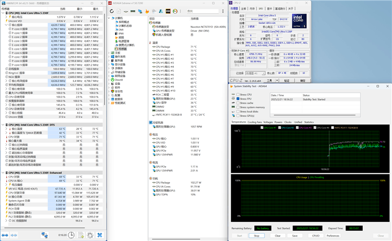 我们用AIDA 64进行了十五分钟的烤机测试,最终Intel酷睿Ultra 5 230F处理器的功耗稳定在95W左右,温度69度,P核频率4.8GHz,E核频率4.4GHz。