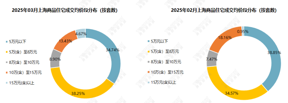 03月, 各均价段占比变动较大。其中5-8万元均价段为成交主力,占比38.25%,较上月上升3.68个百分点;5万元以下均价段占比为34.74,下降4.11个百分点;8-10万元占比上升1.44个百分点,为8.90%;10-15万元本月占总量的13.43%,下降4.73个百分点;15万元以上占比4.67%,上升3.72个百分点。