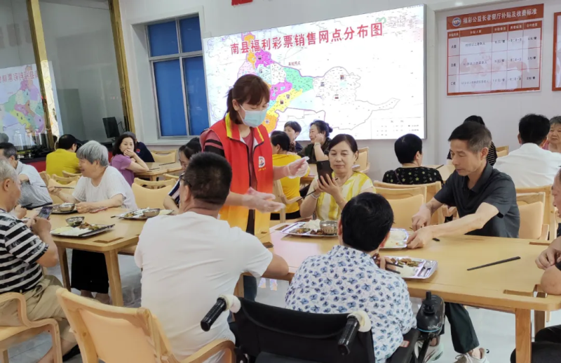 湖南南县东红社区福彩公益长者餐厅里,飘出了阵阵饭菜的香味。李爷爷和社区邻居围坐在一起,品尝着可口的饭菜,脸上满是满足的笑容。