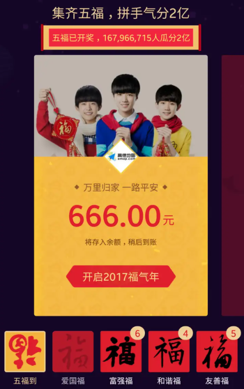 这个活动最早诞生于 2016 年,当时最终 79 万人集齐五福,瓜分了 2.15 亿现金,每人分了 200 多 ~