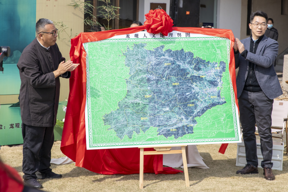 《回望秘境-龙观人文地理舆图》的发布成为开茶节的一大亮点。这份舆图以“时空叠影”为构思,正面融合百年前《鄞县通志地图》与当代卫星影像,背面影印清代《四明鹳岭志略》文献,生动展现了四明山东麓的自然地理与人文底蕴。龙观乡有关负责人在发布仪式中表示:“舆图不仅是文化琥珀,更是生态罗盘,指引我们在守护山水禀赋中培育特色产业。”