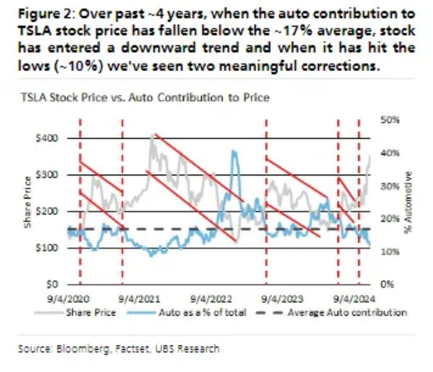 瑞银的报告称,当前特斯拉的汽车业务占总市值的比重仅为12%,最低一度触及10%。瑞银同时表示,而每当核心汽车业务的市值占比达到近期平均水平(约17%)时,股价往往会进入“下行通道”。过去四年中仅发生过两次,分别给特斯拉股价带来了超过30%和70%的回调。所以目前很难看出汽车业务下滑,就一定会引发较大的回调,如果只有汽车业务在增长才会比较麻烦。