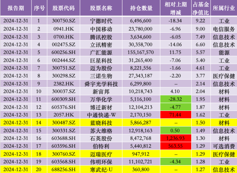 据此前披露的四季报,在该基金前十大重仓股中,赵枫小幅加仓了中国财险(02328.HK)、腾讯控股(00700.HK)、中国太保港股(02601.HK)。此外,山西汾酒(600809.SH)首次进入该基金的前十大重仓股名单中,小米集团(01810.HK)则时隔三年多重返持仓前十;在减持方面,2024年四季度赵枫大幅减仓了万华化学(600309.SH)、中国移动(00941.HK)、宁德时代(300750.SZ)、三诺生物(300298.SZ)。