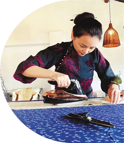 她还喜欢收集各种真丝面料。有一天,她拿着这些面料想请裁缝制作一件旗袍。“当我把自己对旗袍的设计想法提出来之后,裁缝却说实现不了,不接我这个订单。我就决定自己学习制作旗袍。”韩敏说。2020年,韩敏找到金华浦江的“旗袍制作技艺”传承人赵芳英,系统学习了两个月,掌握了一片式裁剪、归拔等传统旗袍制作工艺。